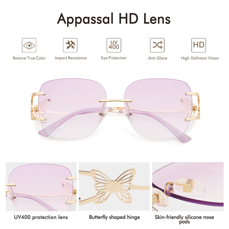- BUTTERFLY SUNGLASSES - Oversized butterfly sunglasses feature clear colored lenses with gold temples and hollow butterfly hinges. Appassal's new Butterfly collection, all butterfly sunglasses for womens are suitable for wearing in the spring sun.