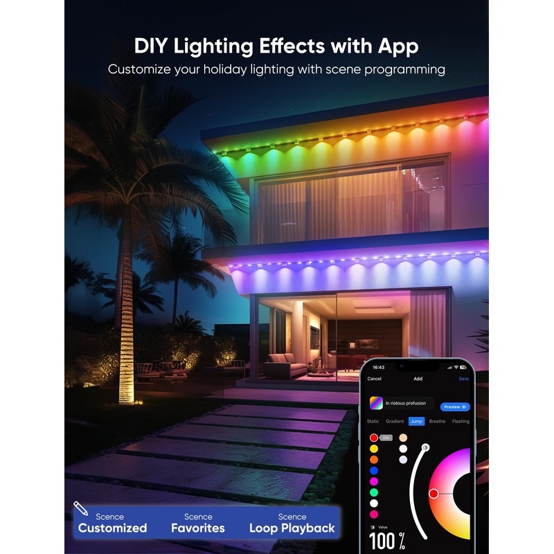 - Warm White and Cool White Lighting: The APPECK permanent outdoor lights adds warm and cool white LEDs, designed for daily lighting and accent lighting. Up to 65 lumens per light, color temperatures range from 2700K-6500K and support brightness adjustment