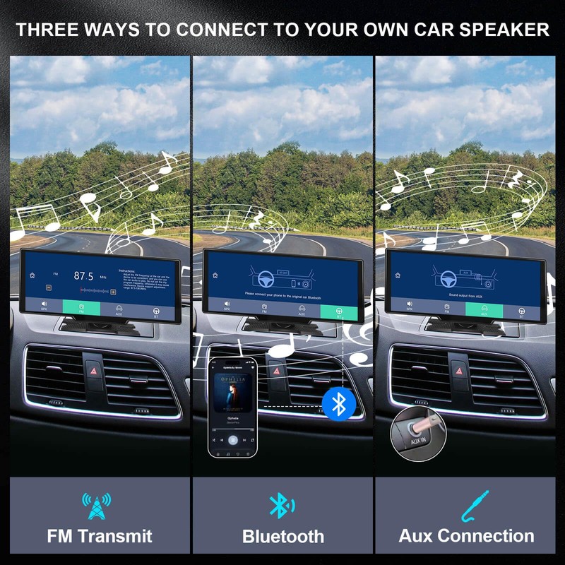 - 【Your car entertainment system & Hands-free Calling】: The monitor transmits your music wirelessly to your car radio via Bluetooth 5.2 for wireless music streaming and playback . Answer calls easily using the touchscreen icons, Optionally, you can connect the monitor to your car radio via an audio cable. If you wish, you can also play your favorite music from a memory card