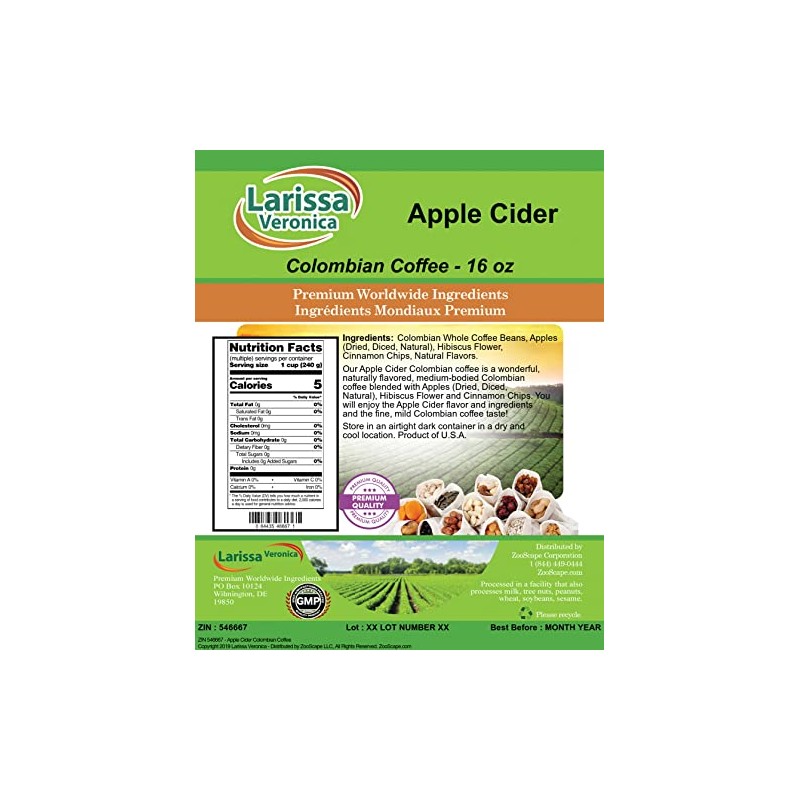 - Our Apple Cider Colombian coffee is a wonderful, naturally flavored, medium-bodied Colombian coffee blended with Apples (Dried, Diced, Natural), Hibiscus Flower and Cinnamon Chips. You will enjoy the Apple Cider flavor and ingredients and the fine, mild Colombian coffee taste! - Ingredients: Colombian coffee (whole coffee beans), Apples (Dried, Diced, Natural), Hibiscus Flower, Cinnamon Chips and Natural Apple Cider Flavor.
