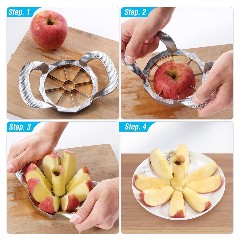 - 【Easy to use】:Choose fruits no bigger than 4 inches, push down toward the center, through the core, and you'll get 8 even slices.you can apply this slicer to most medium-size round fruits such as apples, pears, potatoes, onions, etc. Save more time and energy for enjoying fruits every day.