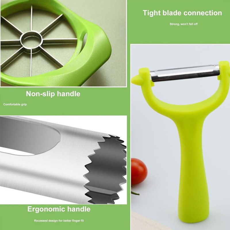 • ✅ UNIVERSAL APPLE CORER AND APPLE CUTTER SET : The apple cutter and corer ,Peelerset makes short work of preparing your fruits. With one simple motion you can cut an apple into beautiful thin slices or remove the core effortlessly. It works well not only with apples, but with potato, tomato, peach, avocado, mango or even orange.