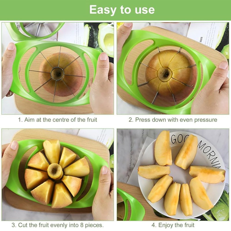 • ✅ CUT FRUITS AND VEGETABLES WITH EASE : One strong push will get rid of the core and slice 12 perfect small apple pieces, The apple cutter has large non-slip handles that provide a firm grip in both wet and dry hands. The durable stainless steel blades won't rust, and stay sharp even after years of use.