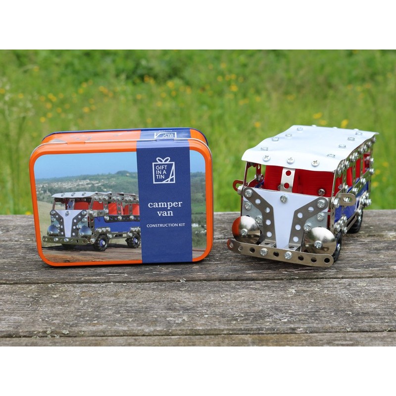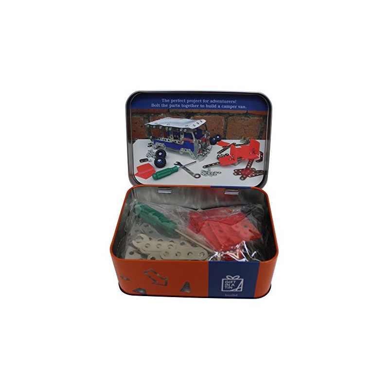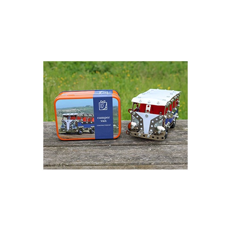 Dreaming about life on the road? Well now you can follow step by step instructions to build your own camper van! Contents: Metal and plastic construction pieces, screwdriver, spanner and instructions. Tin dimensions: 100mm High x 145mm Wide x 55mm Deep CHOKING HAZARD. Small parts - not suitable for children under 3 years.