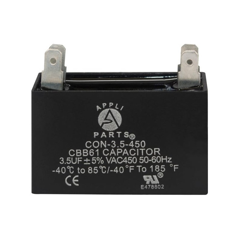 Appli Parts Fan Capacitor 3.5 mfd (microfarads) uf 450 VAC with 4 Terminal Connections compatible with any brand within the same range capacitance 1-7/8in Width 3/4in Depth 1-1/2in Height CAP-3.5-450