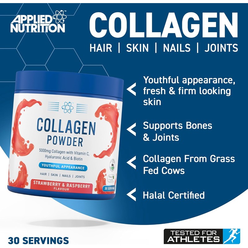 Applied Nutrition Collagen Powder - Strawberry & Raspberry Flavour - 5000mg Hydrolysed Bovine Flavoured Collagen Peptides with Vitamin C, Hyaluronic Acid & Biotin (165g - 30 Servings)