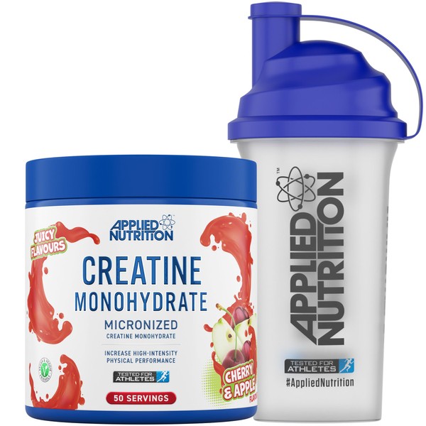 Applied Nutrition Creatine + 700ml Shaker | Creatine Monohydrate Micronized Powder with Flavour, Increases High-Intensity Physical Performance (250g - 50 Servings) (Cherry & Apple)