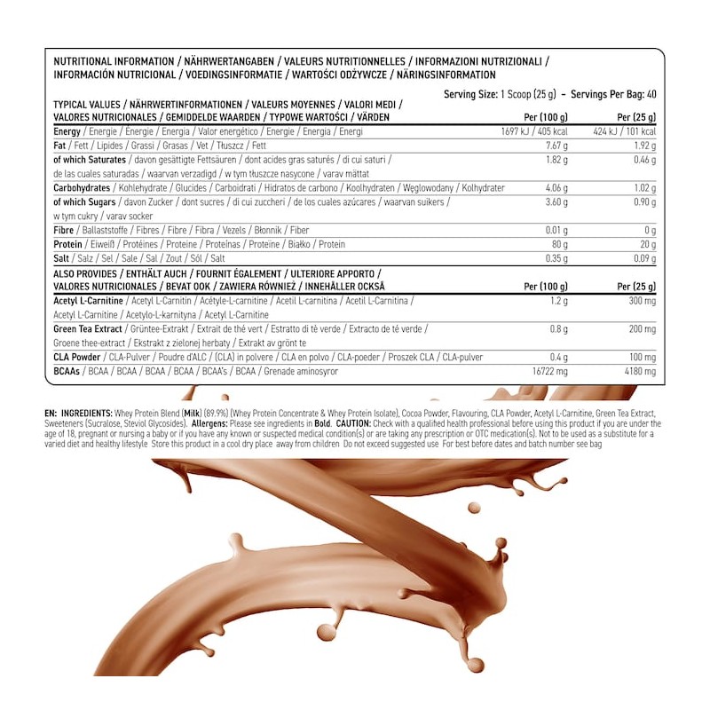 Whey Protein Blend (Milk) (89.9%) (Whey Protein Concentrate & Whey Protein Isolate), Cocoa Powder, Flavouring, CLA Powder, Acetyl L-Carnitine, Green Tea Extract, Sweeteners (Sucralose, Steviol Glycosides).