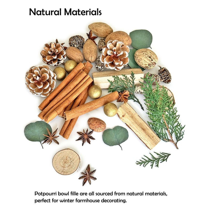 - Natural Materials: Cinnamon sticks, star anise, eucalyptus leaves, birch sticks, birch discs, cedar branches, white pine cones, wood mango, golden crabapple and other dried potpourri are all sourced from natural materials, perfect for winter farmhouse decorating. The scent will fill your house like it's Christmas every day.