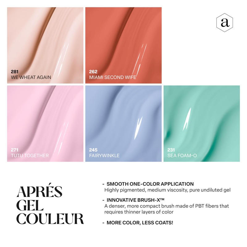 Apres Gel Couleur Combo Set, 5 Color Gel Nail Polish, Bright Nude Pastel Colors with Brush-X Nail Art Brush, 2024 Edition (Set 16)
