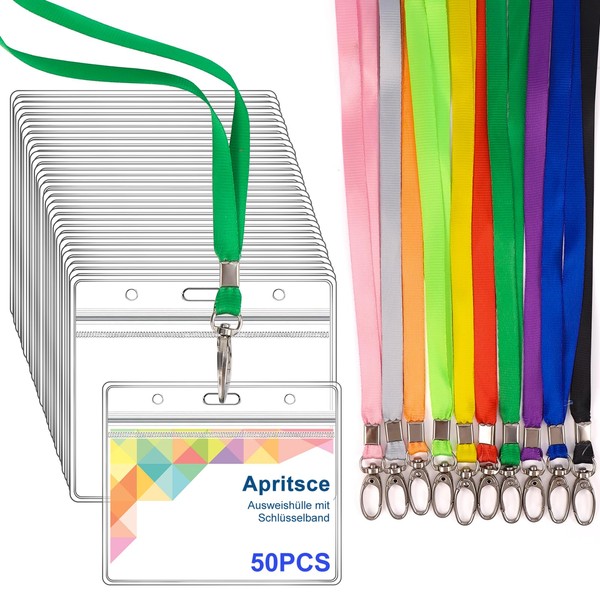 Apritsce ID Card Holder with Strap, Pack of 50 Card Holders with Lanyard, Waterproof Transparent ID Case, Lanyard with Card Holder for Business, Exhibition and Office (Colour, Horizontal)