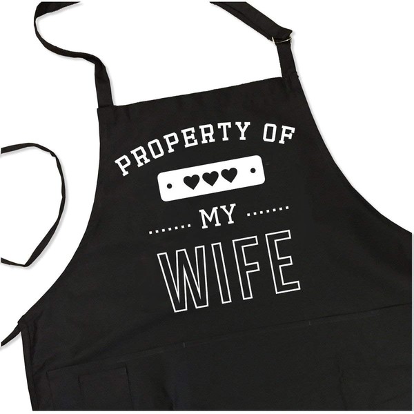 ApronMen, Property of My Wife Funny Aprons For Men with Adjustable Straps One Size Fits All BBQ Grilling Aprons With Pockets - Professionally Printed Gifts For Dad
