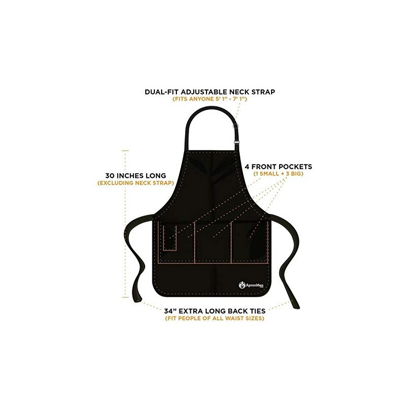 • One Size Fits All: Measuring 30" L x 24" W our chef apron for men is durable with an all-in-one adjustable sliding neck loop and extra-long waist ties (tied in the back or front).