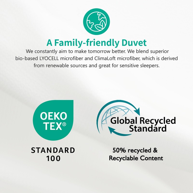 - FAMILY-FRIENDLY DRIVEN -- The duvet insert with our unique ClimaLoft polyester blend Lyocell (renewable sources from Eucalyptus fiber) microfiber is a hydrophilic treatment designed to allow quick absorb moisture and sweat and fast drying, regulate your temperature cleverly to keep cooler, drier and warmer for a better sleeping experience. Approved by GRS and OEKO-Tex Standard 100.