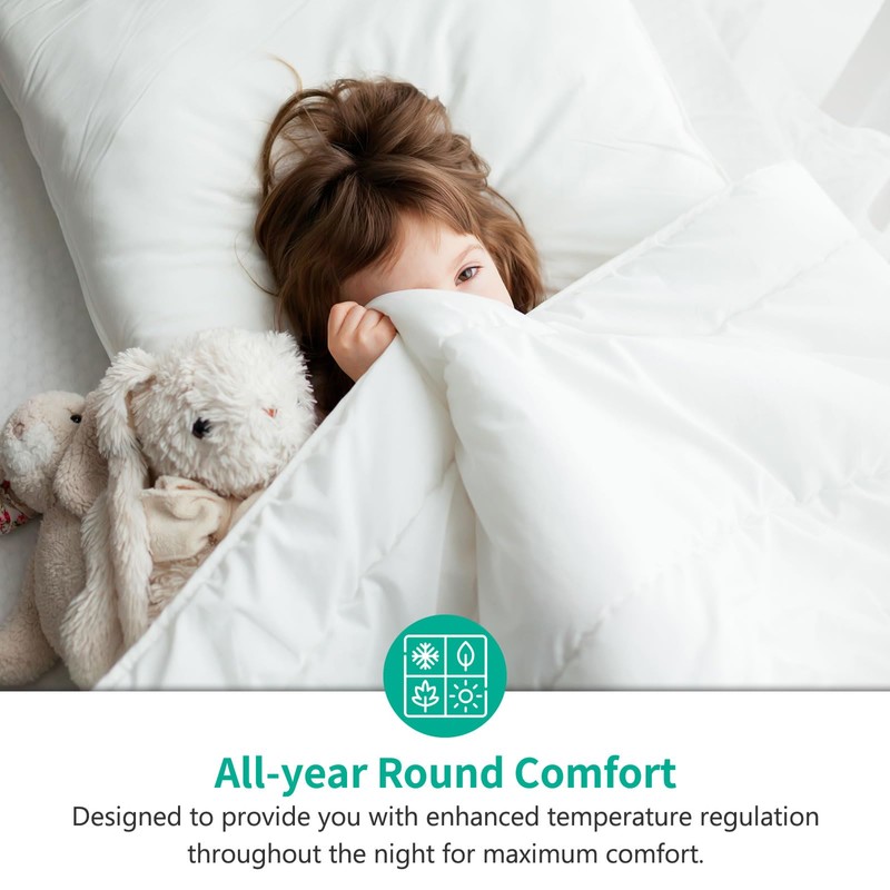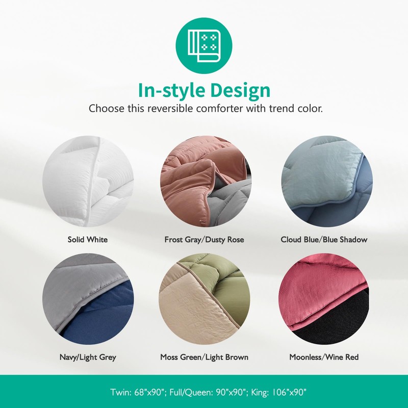 - THERMOREGULATING ALL-YEAR ROUND -- All-season KING SIZE bed comforter is 106x90 inches and 250gsm cooling down alternative microfiber filled. Our down alternative comforter is constructed for year-round comfort and provides medium warmth for most people/weathers - no matter the cooling summer, autumn, spring, or cold winter night.
