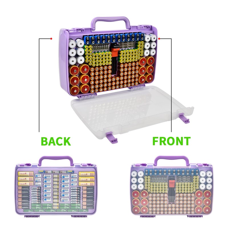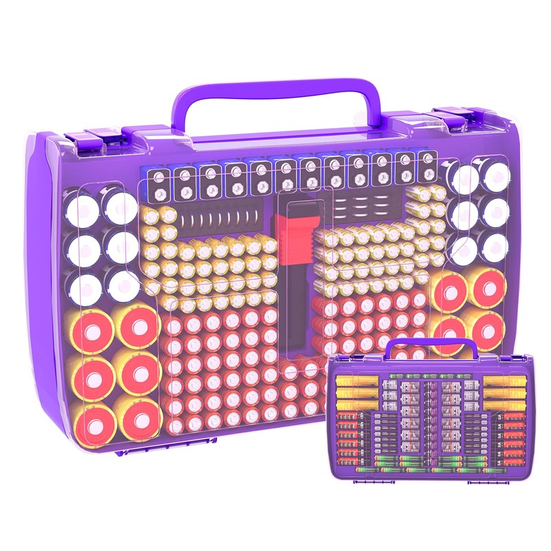 Aptbyte Battery Organizer Storage Holder Box Case with Tester- 269 Batteries Double-Sided Variety Pack, Holds AA AAA 4A C D Cell 9V 3V Lithium LR44 CR2 CR123 CR1632 18650 Button- Purple (Box Only)