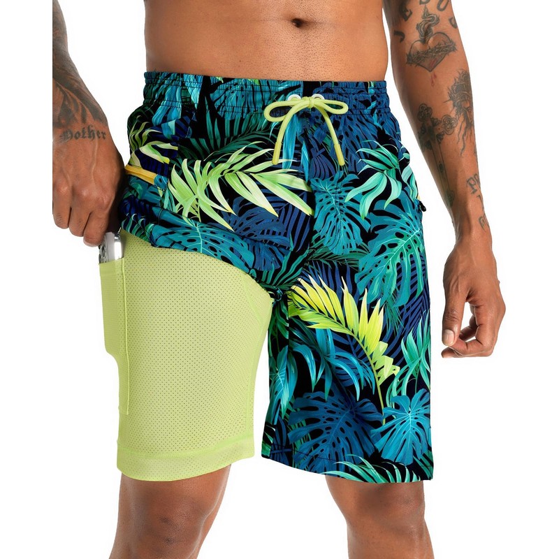 APTRO 2 in 1 Men's Swim Trunks 9" with Zipper Pockets Bathing Suit Built-in Board Shorts Swimwear Long Shorts Palm Green L