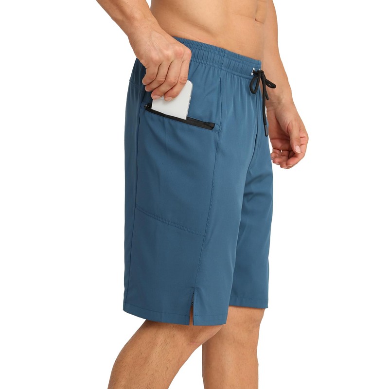 - Features---Men's swim shorts are made of 92% polyester and 8% elastane. Soft and stretchy fabric with lightweight and quick dry properties. 9 inch inseam. Elastic waistband with high quality coloured drawstring