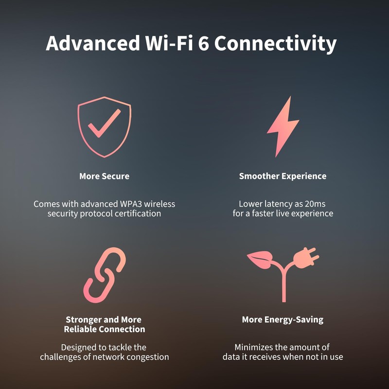 • Advanced Wi-Fi 6 and WPA3 SecurityThe Security Camera E1 supports Wi-Fi 6 connectivity, an advanced wireless protocol known for its improved performance, even in the most congested network environments, for smoother live views and lower latency. Moreover, the latest Wi-Fi security standard WPA3 is supported to further protect your data. (Note: Requires 2.4 GHz Wi-Fi, and 5 GHz Wi-Fi is not supported.)