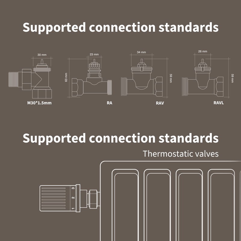 - ✽[NOTES] An Aqara Zigbee 3.0 Hub is required and sold separately. The Aqara Smart Radiator Thermostat E1 is compatible with a wide range of the ecosystems and voice assistants. HomeKit, Alexa, Google, IFTTT and the soon to be released Matter will be supported. The Radiator Thermostat E1 can fit most of the radiator valves directly (Threaded Connection: M30×1.5 mm) or with our adapters (Adapters RA/RAV/RAVL are included).
