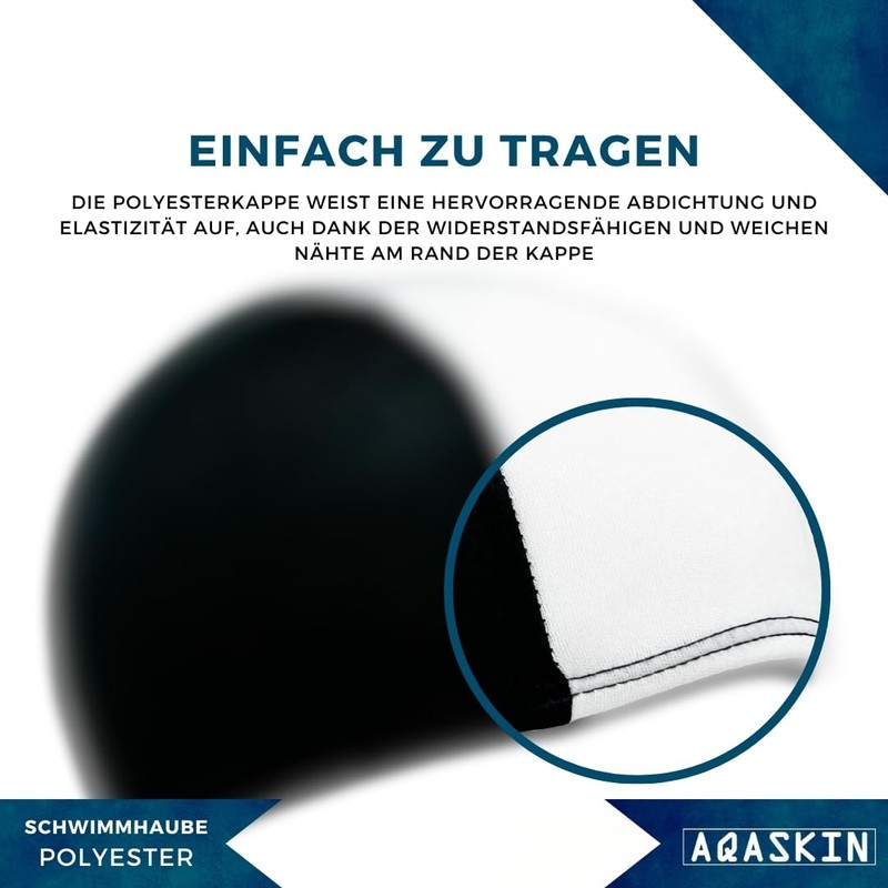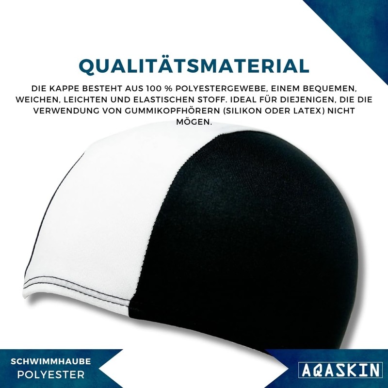 - Swimming cap made of polyester fabric, ideal for anyone who cannot make friends with classic swimming caps made of silicone or latex. The AQASKIN polyester swim cap is ideal for short training sessions or simply for a relaxing dip in the pool. Due to the comfortable elastic band, we recommend the use of children from 6 years and adults.