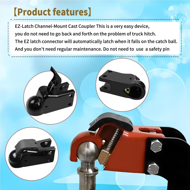 - Product features:EZ-Latch Channel-Mount Cast Coupler This is a very easy device,you do not need to go back and forth on the problem of truck hitch. The EZ latch connector will automatically latch when it falls on the catch ball. And you don't need regular maintenance. Do not need to use a safety pin
