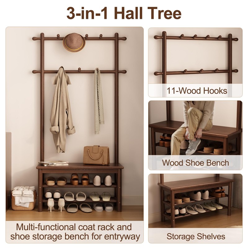 - [3-in-1 Coat Rack] Our hall tree combines three functions in one: hooks for coats and bags, a shoe bench for changing shoes, and a shoe rack to organize your footwear—this freestanding coat rack brings you a tidy, convenient, and cozy entryway at home