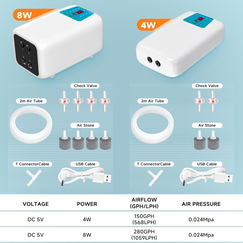 - Ultra-Quiet Aquarium Bubbler with Premium Accessories: Includes 2 air stones, 2 check valves, 6.5ft (2m) tubing, and 1 T-connector. Attach the T-connector can Use one outlet,which can to prevent motor damage and noise . Works in freshwater/saltwater tanks up to 150 gallons.