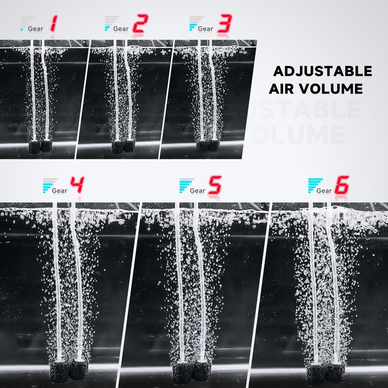 - Dual Modes + 6-Level Airflow Control: Choose continuous mode (steady bubbles) or intermittent mode (energy-saving pulses) via one-touch button. Adjust airflow from gentle (Level 1) to powerful (Level 6) using +/- buttons. LED display shows airflow level and 4-bar battery indicator (25%/50%/75%/100%).