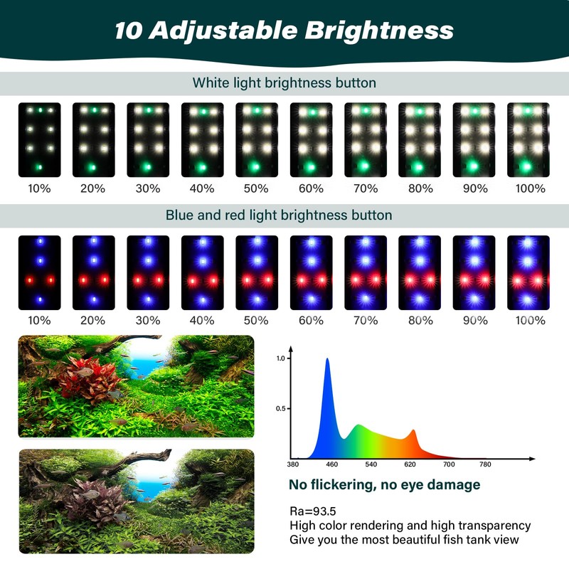 - Time Funcation: Three time period timing,6H,10H,12H; Once the timing period is set, it will automatically cycle every day; For example, if the timer is set at 9:20 am for 6 hours, the lights will turn off at 15:20 am today and automatically turn on at 9:20 am the next day.Reduce your workload and ensure sufficient lighting time in the fish tank