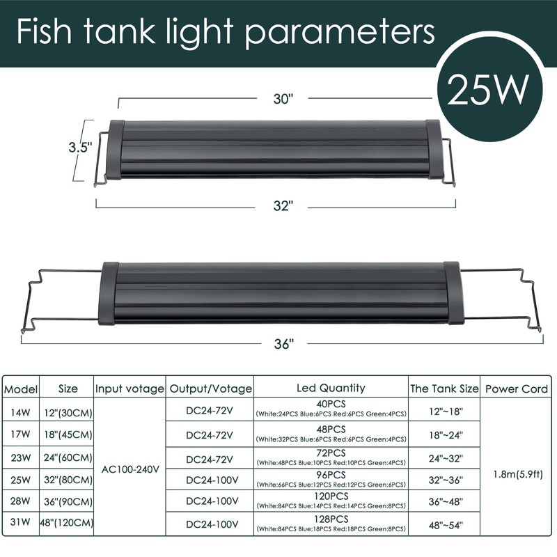 - 25W Classic Aquarium Light: Suitable 32 inch-36 inch fish tank; Input votage is AC100-240 V; Output votage is DC24-72 V; 96 pcs LEDs(White-66 pcs Blue-12 pcs Red-12 pcs Green-6 pcs); Power cord is 5.9 ft(1.8 m); Lumen is 1589 lm; Kelvin is 6500 K white LED