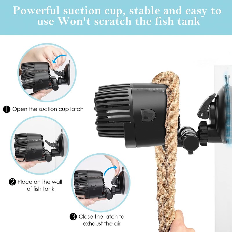 - 🐟【Strong suction cup,Ultra quiet fish tank circulation pump】Strong suction cup can be adsorbed on any corner of the glass wall of the fish tank without damaging the glass and make scratches, regardless of the thickness of the fish tank wall.increase the shock absorber nail design,reduce vibration,ultra-silence.Pump must be completely submerged water,noise is almost inaudible, lower than 30 decibels, and can be used for the quiet pump in the bedroom.