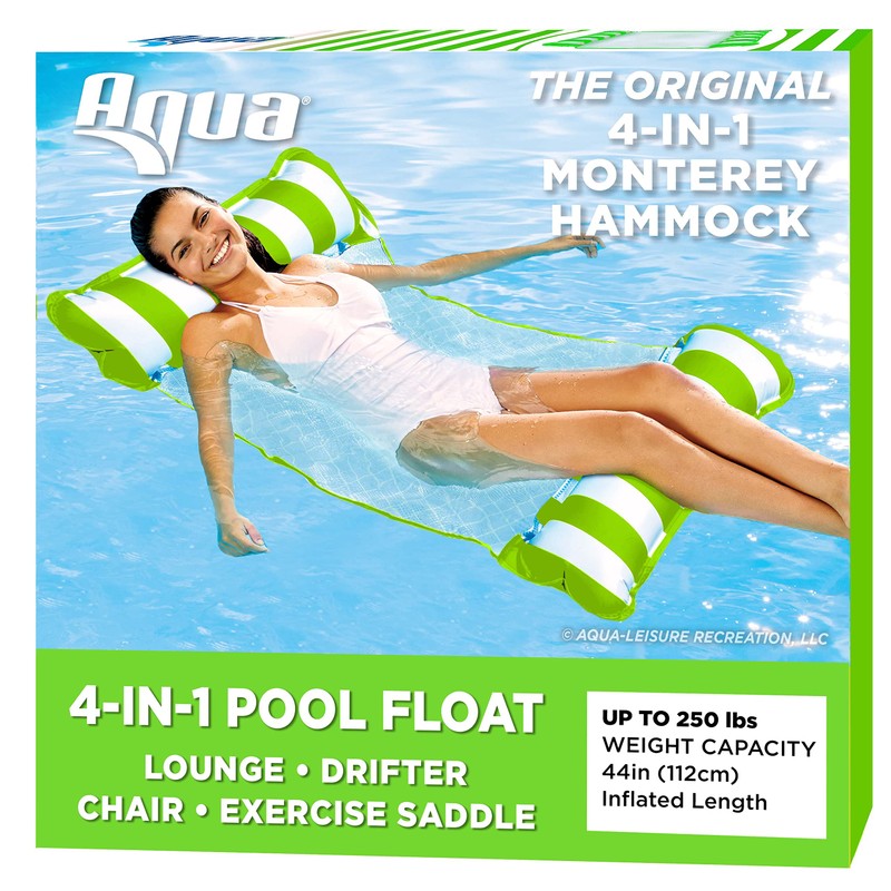 Aqua 4-in-1 Monterey Hammock Inflatable Pool Float, Multi-Purpose Pool Hammock (Saddle, Lounge Chair, Hammock, Drifter) Portable Water Hammock, Lime Green /White Stripe