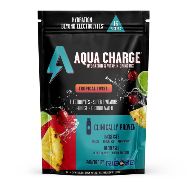 Aqua Charge Hydration & Vitamin Drink Mix, Raspberry Lemonade,16 Packets, Sugar-Free Electrolytes with B Vitamins, Naturally Flavored, Vegan, Gluten-Free, Non-GMO (16 packs, Tropical Twist)