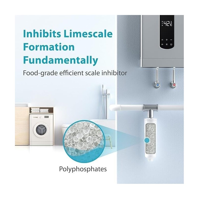 - 【Efficient scale inhibition】This scale inhibitor's food-grade polyphosphate can inhibit limescale formation by preventing calcium and magnesium ions from precipitating and combining, and reduce corrosion by forming a protective layer on the inner surfaces of shower heads, water heaters, faucets, pipelines, and other pipelines.