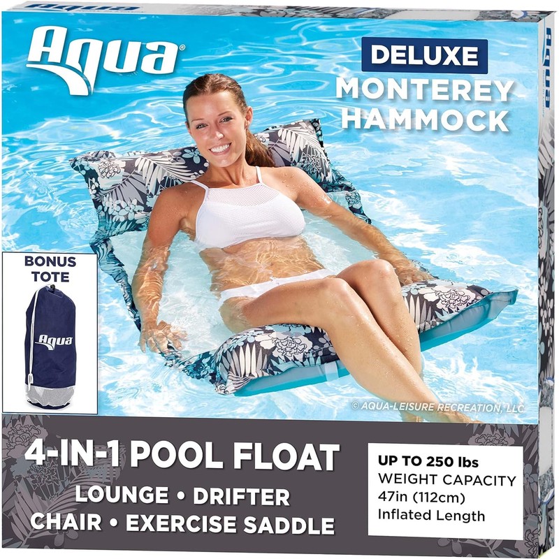 Color: Antigua blue – premium Deluxe hammockcolor: Antigua blue/white the premium Deluxe Monterey 4-in-1 lounge system Features premium Aqua Lux fabric that is highly resistant to fading. The lounge boasts a versatile 4-in-1 float system: Choose from a hammock, lounge chair, Drifter, and exercise saddle. This multi-purpose lounge quickly converts for relaxing, socializing, and even exercising in the pool! Folds easily into the drawstring bag making the lounge perfect for on-the-go and storage. Easily inflates and deflates with DuoLock inflation valves. Inflated size: 50” x 28” (127 cm x 71 cm) weight capacity is 250 lbs. Recommended for ages 15 and up.-Versatile: Monterey 4-in-1 hammock offers 4 unique positions! Hammock, lounge chair, Drifter and exercise saddle. Great for free-motion water (Aerobics) exercise.-Recline-relax-dream: supportive mesh lining keeps you cool as you relax on the water’ s surface.-#1 customer comment: “ easiest pool float to get on and get off of while in the water.&Rdquo; -perfect size: 50” x 28” (112 cm x 71 cm) -ages 15 and up; Weight capacity 250 lbs.