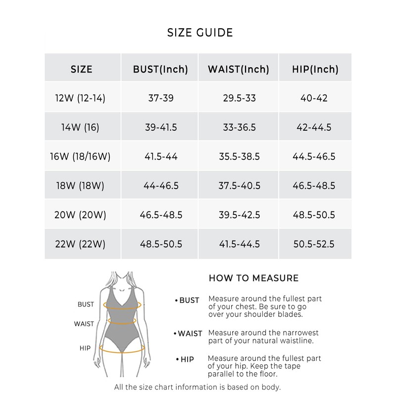 - Rango de tallas: 14 Plus (EE. UU. 14 W), 16 Plus (EE. UU. 16 W), 18 Plus (EE. UU. 18 W), 20 Plus (EE. UU. 20 W), 22 Plus (EE. UU. 22 W). Consulta la tabla de tallas a continuación antes de realizar una compra.