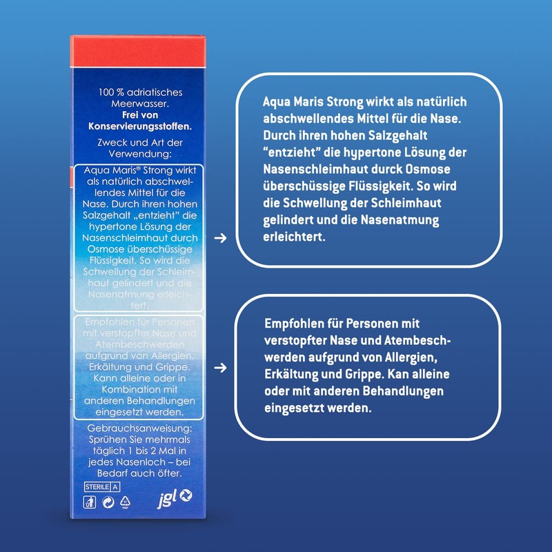 • Die hohe Konzentration von Meersalz erm?glicht die Entfernung 1bersch1ssiger Fl1ssigkeit aus der Nasenschleimhaut, was die Schwellung zus?tzlich reduziert und die Durchg?ngigkeit der Atemwege verbessert.