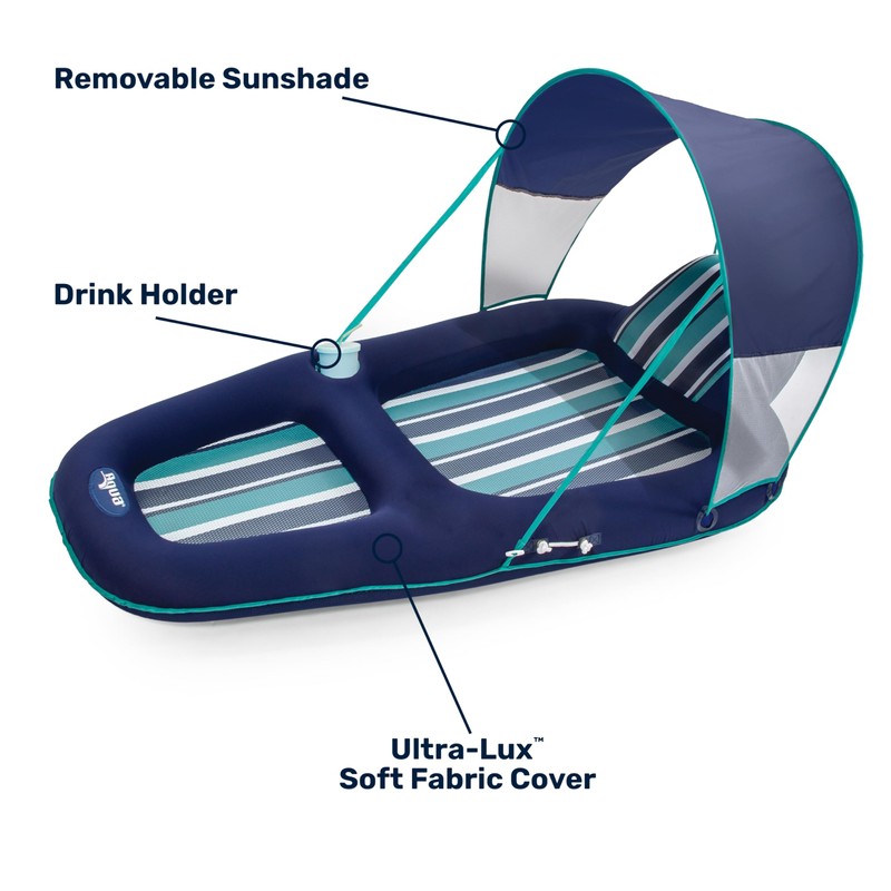 Aqua Ultimate Pool Float Lounger with UPF 50 Canopy and Cupholder – Heavy Duty, Inflatable Pool Lounge for Adults – Navy/Aqua/White Stripe