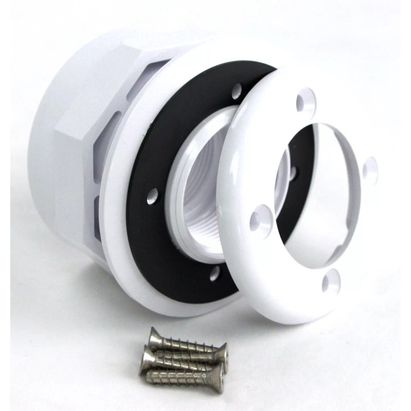 This replacement return inlet fitting can be used for Hayward inlet fittings and is compatible with vinyl or fiberglass swimming pools. Inlet fitting is made of heavy duty ABS construction. It includes gaskets, locking ring and stainless steel screws. Also comes with combo locknut/spacer and with face thread in body. Pipe measures 1-1/2 by 1-1/2-inch FIP.