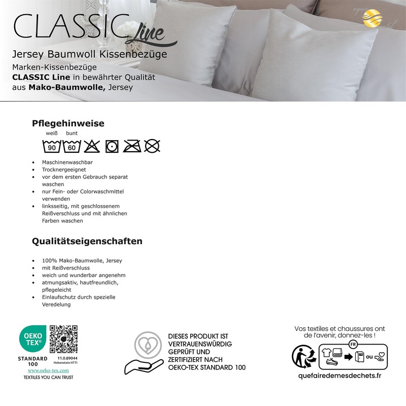 - All pillowcases and side sleeper pillowcases bear the Oeko-Tex Standard 100 label. The jersey cotton covers are equipped with shrink protection thanks to a special finish.