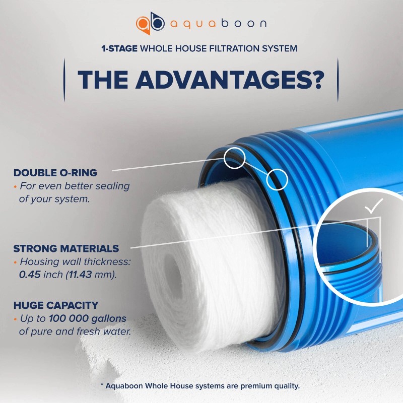 [QUALITY] You will be pleased with the Aquaboon water filter wound housing 5 micron as it is constructed of a high flow reinforced polypropylene and is perfectly sealed to withstand heavy pressures (up to 90 PSI), resist heat (up to 125°F). Be sure in its safety since it is approved by NSF to correspond all security requirements regarding its construction as well as its appliance in the food industry.