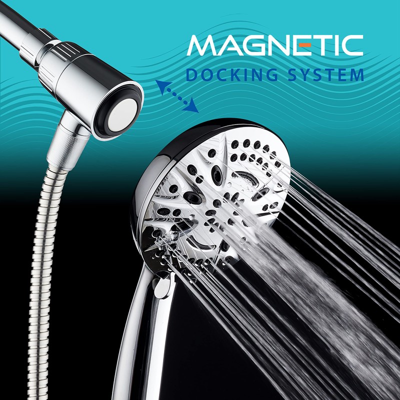 LATEST MAGNETIC DOCKING TECHNOLOGY - This unique patent-pending Socket-lock Guidance System with curved-surface design guides connecting magnets to align, so you can dock your hand shower literally with your eyes closed! Unlike other magnetic showers, AquaDance doesn't require additional hook or lock supports to remain secure. It finds its aim automatically, locking precisely and securely every time. Just place the back of AquaDance head against the bracket and watch it dock magically by itself!HIGH-PRESSUREGIANT 5 INCH HEAD - Advanced 4-zone Click Lever Dial delivers water flow with an amazing power and precision. Its Extra-large 5 Face provides drenching shoulder-to-shoulder flow coverage, while Rub-clean Jets help protect nozzles from clogging. So you get a fuller, more powerful and efficient shower every time, even if your home has low water pressure!8 LUXURY FLOW SETTINGS - Use Power Rain, Pulsating Massage, Hydro-Mist, Dual Jet, ON/OFF Pause mode and three mixed settings. Developed in USA by top American showerhead experts, this new Aquadance Magnetic Hand Shower was designed to exceed top US quality and performance standards and deliver unmatched High-pressure Shower Spa Experience. And its premium spot-resistant metal-plated finish will never crack, chip or fade.INSTALLS IN MINUTES, NO TOOLS! - Connects to any standard shower arm. Comes complete with Washers, Plumber's tape and Lifetime Warranty directly from Aquadance. Enjoy first-rate American Customer Service from top-rated, trusted American shower brand with live US showerhead experts ready to assist you on the phone or by email. Comes in elegant packaging for a Perfect Gift.UPGRADE CONVENIENCE PACKAGE - With Angle-adjustable Magnetic Docking Bracket for hands-free overhead use, plus the extra-long 72-inch Heavy-duty Stainless Steel Hose for targeted up-close use with more reach and mobility, AquaDance Magnetic Shower can be used as an Overhead or a Handheld Shower by everyone in your family. It is the ultimate shower system for Showering, Bathing, Child Care, Senior Care and Pet Care applications.