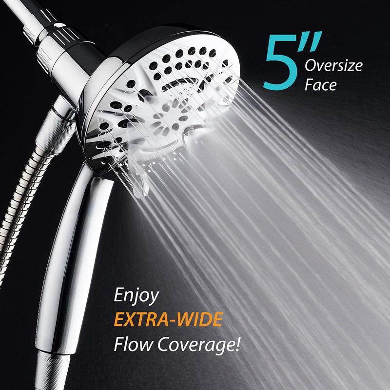 - HIGH-PRESSURE GIANT 5 INCH HEAD - Advanced 4-zone Click Lever Dial delivers water flow with an amazing power and precision. Its Extra-large 5 Face provides drenching shoulder-to-shoulder flow coverage, while Rub-clean Jets help protect nozzles from clogging. So you get a fuller, more powerful and efficient shower every time, even if your home has low water pressure!