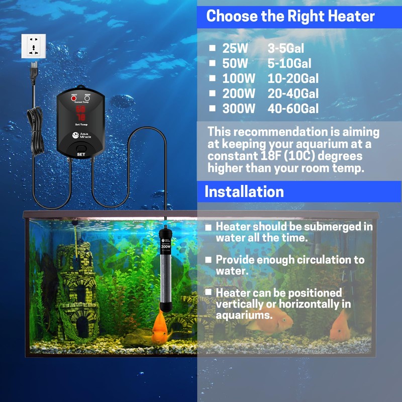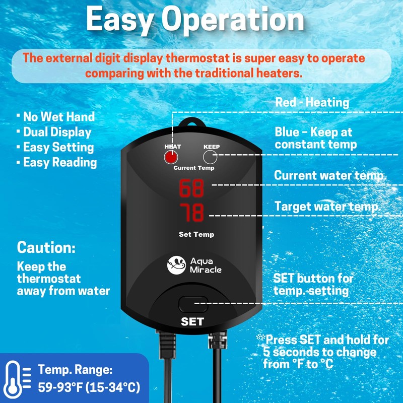 • MORE ACCURATE EXTERNAL THERMOSTAT – The in-built chips of this submersible heater keeps water at a constant temperature at an accuracy of 1F, much more accurate than the traditional knob-controlled heaters. The digital display of the external thermostat shows 2 readings – the current temperature and the set temperature – very easy to operate.