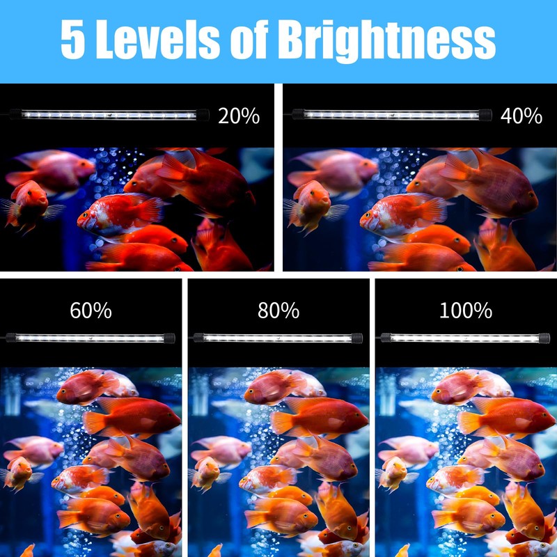 - Timer and Dimmer: built-in timer with three timing modes ( 4, 8, 10 hours); light will automatically be off and on at the time you set. Adjustable brightness with 5 levels of brightness in total from 100% to 20% according to your prefer; The light is soft, close to natural light, it's gentle on the eyes and will not harm your fish