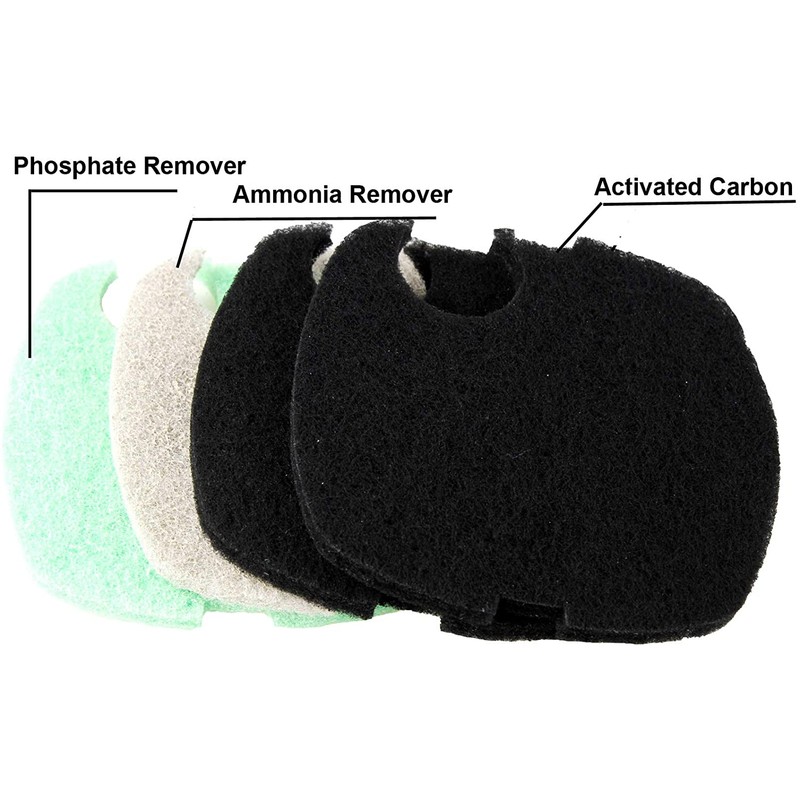 - Provides mechanical, biological and chemical filtration. Includes: 4x sponge bio filter pads (1xCoarse, 2xmedium, 1xfine), 4x bonus filter pads (2x activated carbon, 1x Ammonia, 1x Phosphate Remover), 8x floss filter pads