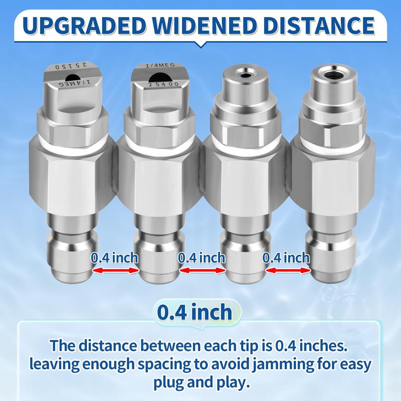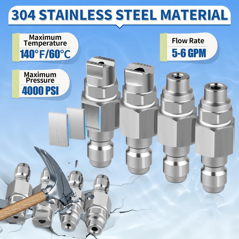- 【Material】4 way pressure washer nozzle is made of stainless steel for excellent durability and corrosion resistance. Fits 5-6 GPM pressure washers and 1/4" quick-connect.