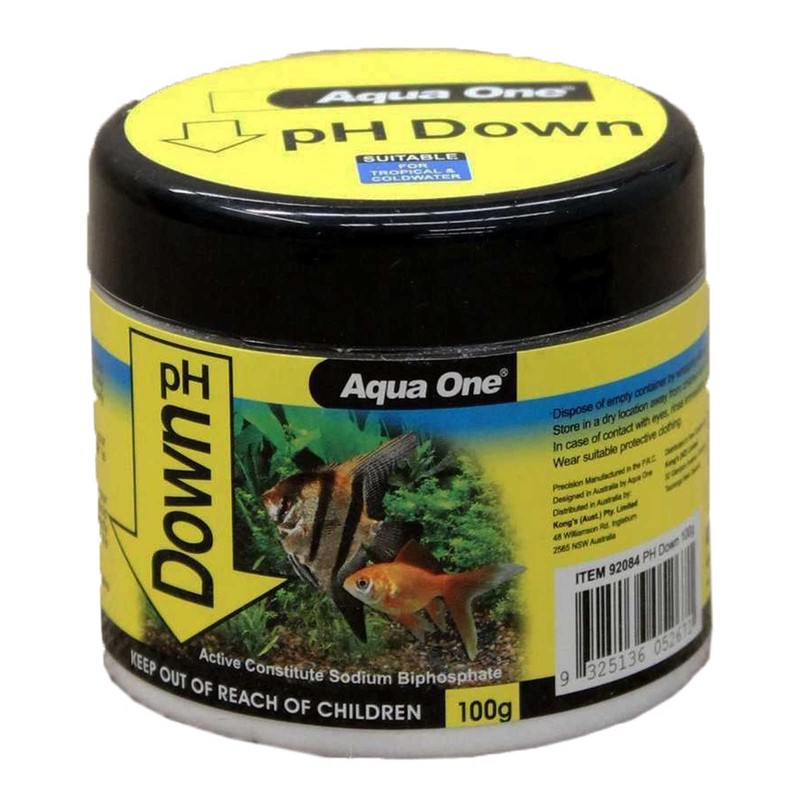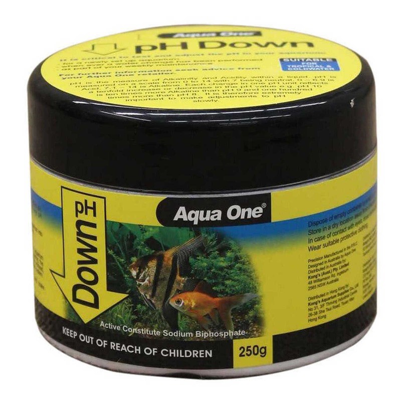 - 1. Using the 2g spoon provided, measure the desired amount of Aqua One pH Down into a clean plastic container. Eg. Use 2g of Aqua One pH Down per 40L of aquarium water to lower the pH by 0.4 per 24 hour period. Every aquarium is unique and many factors affect pH. Use the dosage rate as a guide only and any pH adjustment should be made slowly over time.