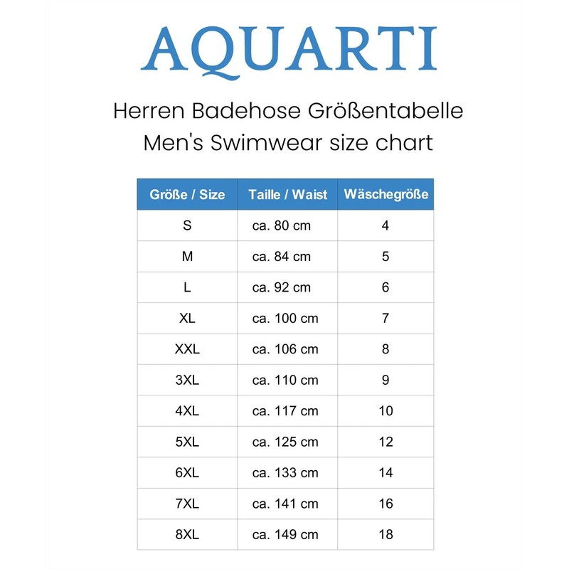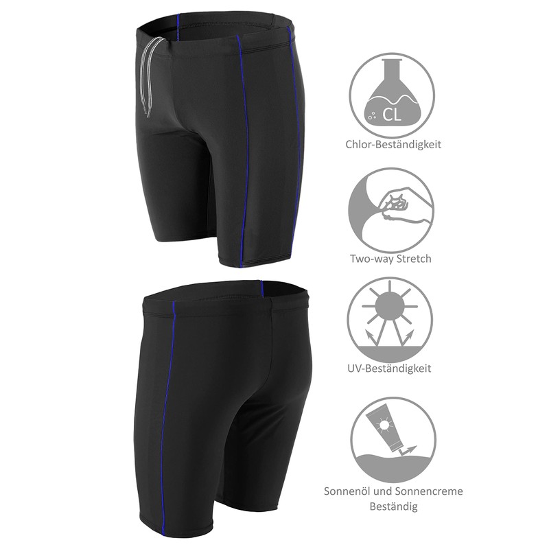 Tight fitting men's swimming trunks with leg to mid-thigh by Aquarti. The simple plain design with contrasting side piping is a perfect choice for regular swimming training as well as relaxing at the beach or pool. Thanks to the high elasticity of the fabric, maximum comfort, a perfect fit and unrestricted freedom of movement are guaranteed. The material is also chlorine/salt water resistant, quick drying and resistant to UV rays and sun cream and oils. The stretchy elastic waistband with drawstring ensures a comfortable, secure fit and does not cut in. Made in the EU.